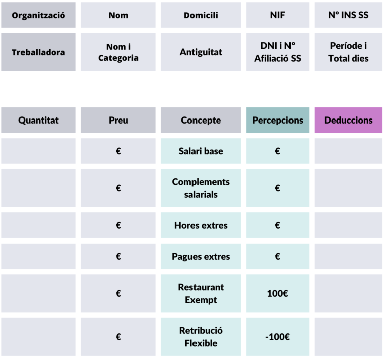 Els conceptes salarials dineraris (salari base, complements, pagues extres…) apareixen de la mateixa manera. Els serveis de retribució flexible apareixeran llistats en positiu, i tot seguit sumats en negatiu (en total, 0€; 100€ de transport – 100€ de retribució flexible). D’aquesta manera queda reflectit que els serveis de retribució flexible formen part del nostre salari brut, però sense alterar els altres conceptes.