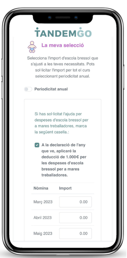 La Clara percep un salari brut mensual de 2500 € i té una filla de 2 anys que va a l’escola bressol. La despesa mensual és de 450 € que paga a través de Tandem Go. Sol·licita la ”Nova deducció per maternitat” i ha seleccionat la casella corresponent a la plataforma.