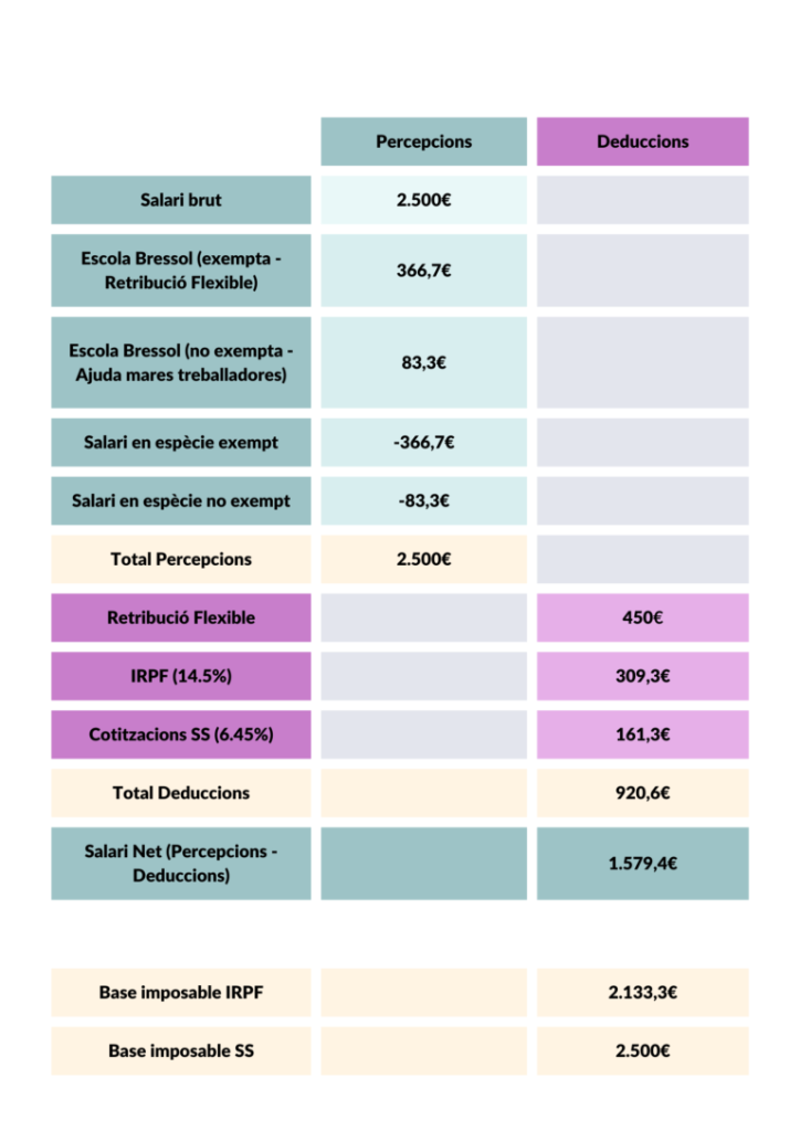 Així doncs, mentre la base imposable de les cotitzacions de la Seguretat Social no varia (2.500 €), la base imposable de l’IRPF es veurà reduïda en el valor de la selecció de serveis d’Escola Bressol dins del pla de retribució flexible (366,7 € exempts). D’aquesta manera, la treballadora augmentarà el seu poder adquisitiu amb el mateix salari.